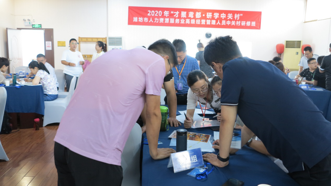 通过沙盘模拟,在实战中体验人力资源管理服务企业的管理方法和理念。研修期间,组织工作坊分组讨论,组织参训学员就潍坊市人力资源服务行业发展现状及趋势、行业创新业态及商业模式、提升企业竞争力及企业间合作等方面进行深入研讨交流。 沙盘模拟教学
